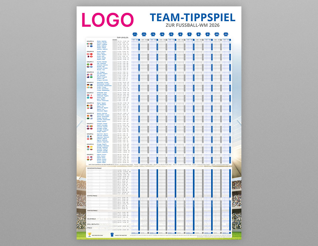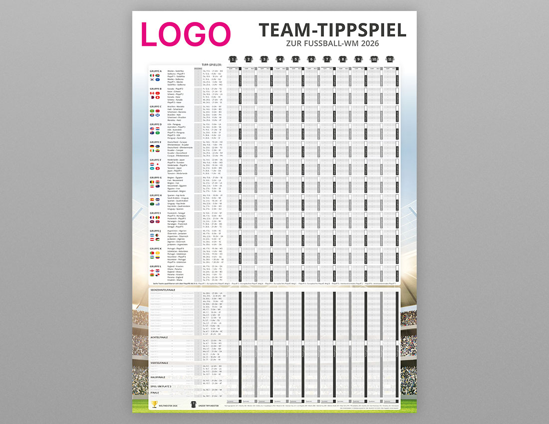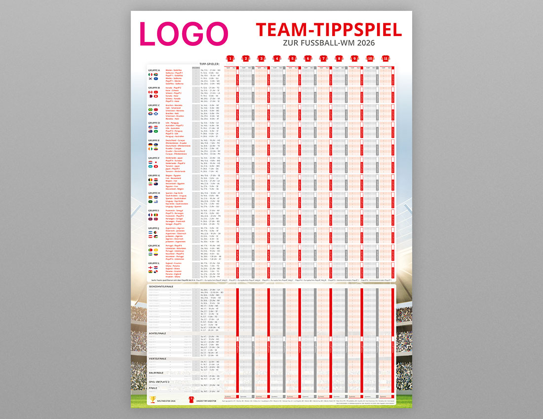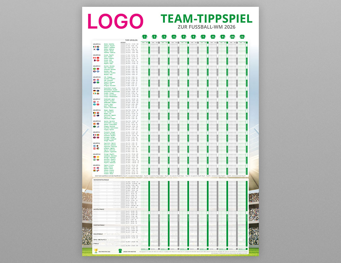 Der WM Tipp Plan für Firmen, gestaltet im individuellen Corporate Design eures Unternehmens, ist mehr als nur ein unterhaltsames Accessoire für die Fußball-Weltmeisterschaft 2026 – es ist eine konstante visuelle Erinnerung an eure Marke. Durch seine prominente Platzierung in Büros oder Werkstätten bleibt das Tippspiel stets im Blickfeld und wird so zu einem effektiven Instrument für kontinuierliche Markenpräsenz.